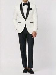 Make an unforgettable entrance with the Cecillio Santini White Marble Shawl Tuxedo, complete with a matching vest and black dress slacks for a polished and cohesive look. The striking white marble fabric, contrasted by a sleek black satin shawl lapel, creates a luxurious and sophisticated ensemble. Ideal for formal occasions, this tuxedo is designed for those who appreciate bold elegance with a touch of modern sophistication.